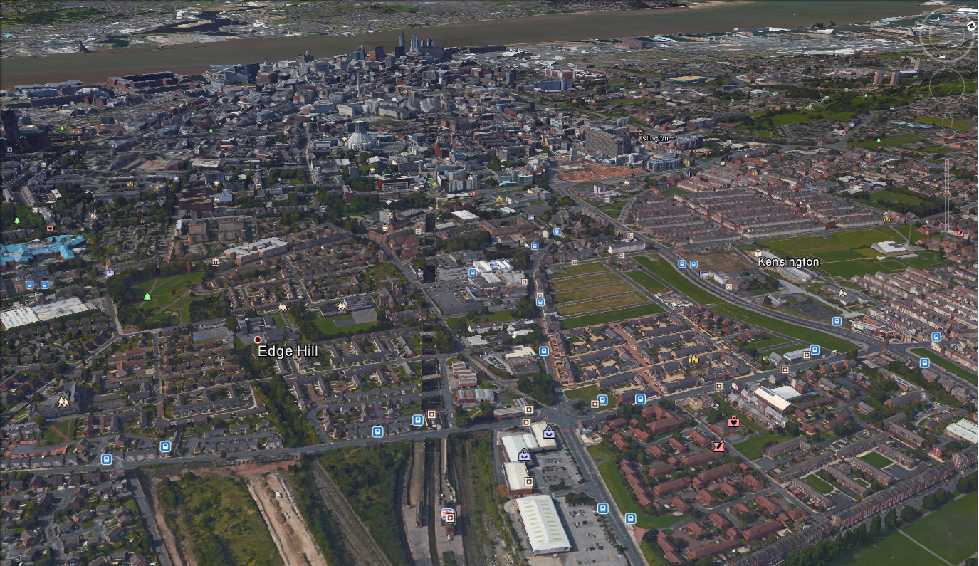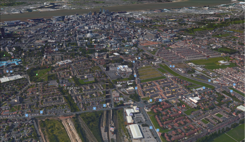 The canyon cuts across the landscape from Edge Hill at the bottom to the arches of Lime Street above