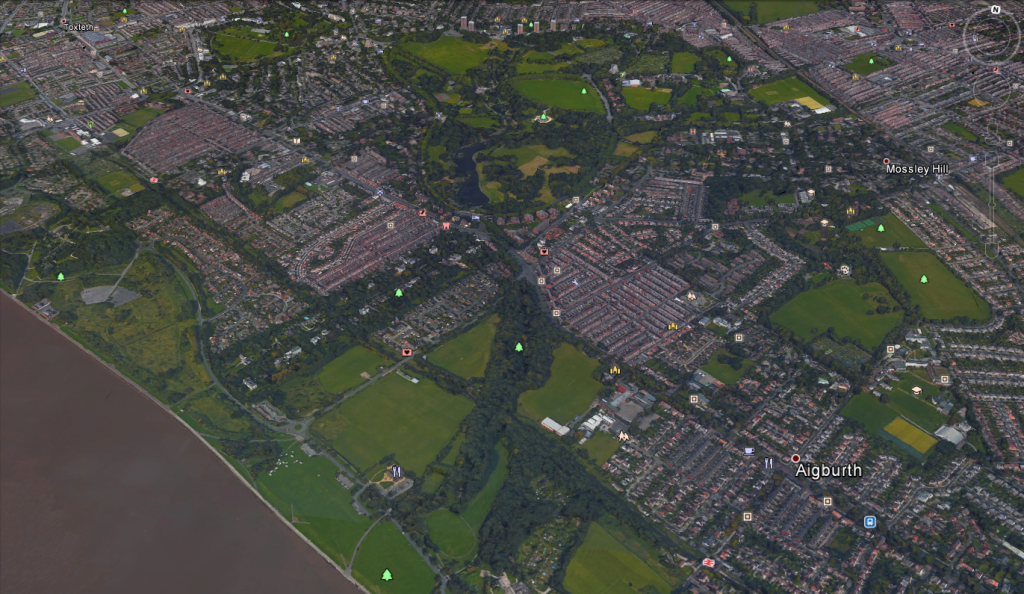 Sefton Boating Lake is linked to the Mersey and its old outflow point, Knotts Hole, revealed by the trees on Otterspool and Aigburth Roads